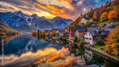 © Arethaawykoff, Naklejka premium Picturesque Lakeside Village at Sunset