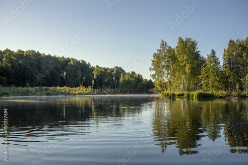 © Sergei, Naklejka premium Picturesque landscape in the morning on the river. Sunbeams illuminate the trees at dawn. Kayaking early in the morning on a calm river in the summer.