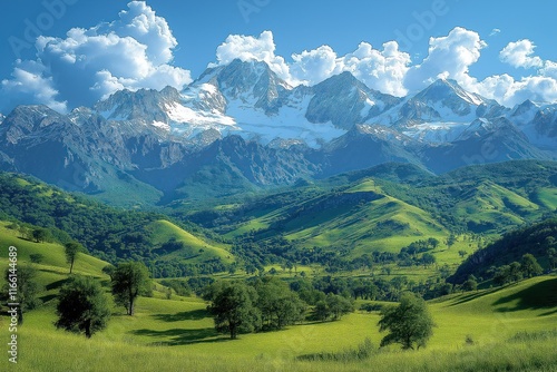 © Vadym, Fototapeta premium Picturesque landscape of green hills, valleys. Snowcapped mountains rise in background under clear blue sky dotted with fluffy clouds. Trees, vegetation thrive in valleys creating scenic view.