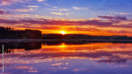 © SerPhoto, Fototapeta premium Picturesque landscape sunset over a lake with forest on a spring evening.