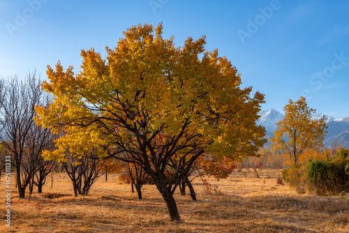 Naklejka premium Picturesque landscape with autumn trees against the backdrop of a snow-covered mountain range in the outskirts of the Kazakh city of Almaty
