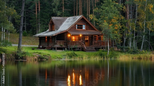 Fototapeta premium Picturesque log cabin by the lake, set in a tranquil forest setting