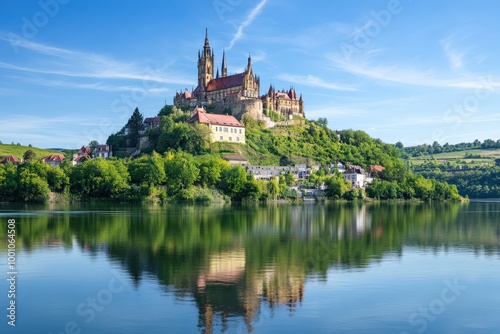 © Bipul Kumar, Obraz premium Picturesque medieval castle on a hill overlooking a serene lake