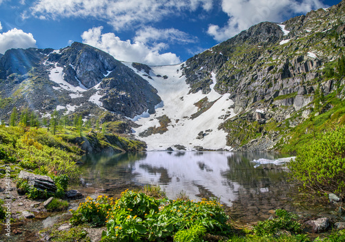 Fototapeta premium Picturesque mountain lake. Spring in the mountains, snow and flowers.