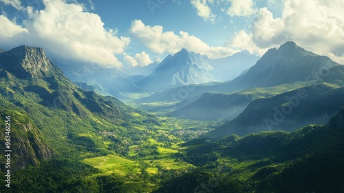 © Penatic Studio, Naklejka premium Picturesque Mountain Valley with Lush Greenery and Cloudy Sky