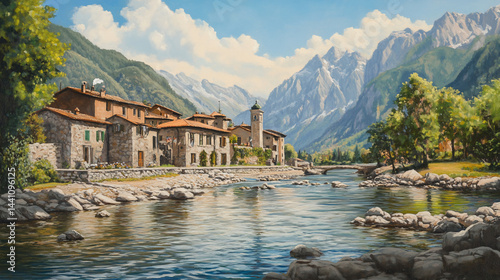 © ADIFERI, Naklejka premium Picturesque mountain village by a river