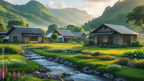 Naklejka premium Picturesque mountain village nestled by a babbling brook.