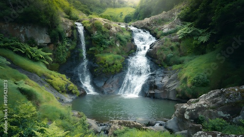 Obraz premium Picturesque Multi-Tiered Waterfall Flowing into a Serene Pool in Lush Green...