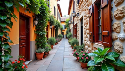 Fototapeta premium Picturesque Narrow Street in Mediterranean Village with Plants and Flowers