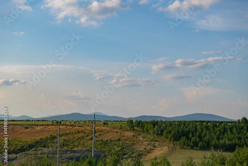 © Vyacheslav, Naklejka premium Picturesque nature of Russia with fields of sunflowers