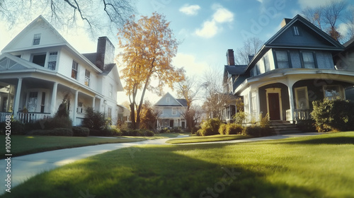 Obraz premium Picturesque neighborhood with charming houses and autumn trees under clear...