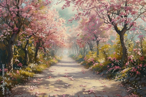 Naklejka premium picturesque pathway lined with blooming trees and flowers in pastel colours.