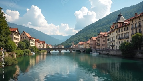 © Undangan, Fototapeta premium Picturesque riverfront town with colorful buildings under a partly cloudy sky.