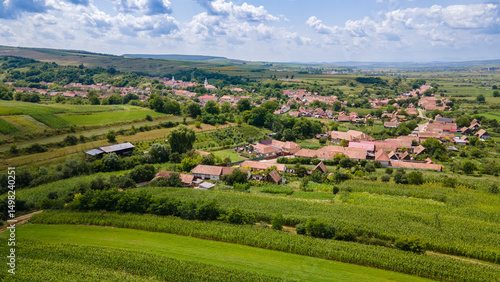 Fototapeta premium Picturesque romanian village with red roofs surrounded by cultivated fields...