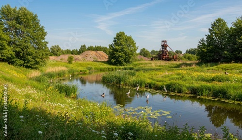 © Akstem, Obraz premium Picturesque scene featuring herons in a river with a historic mine tower.