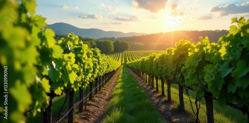 Fototapeta premium Picturesque spring vineyard, vibrant vines bathed in sunlight Rows stretch to horizon , photography, vibrant