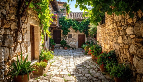 © Shj, Fototapeta premium Picturesque Stone Alleyway with Plants and Flowers in Sunlight, Featuring Cobblestone Path, Ivy Covered Walls and Clay Pots with Bright Greenery