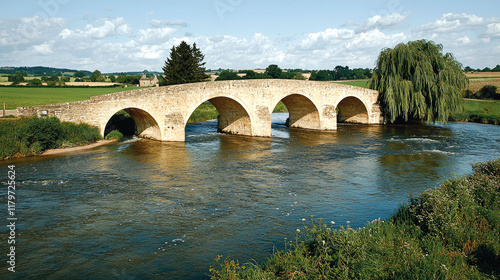 Fototapeta premium Picturesque Stone Arch Bridge over Calm River in Scenic Countryside