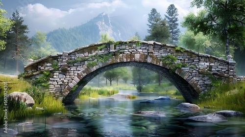 © nabisha, Fototapeta premium Picturesque Stone Bridge Arching Over a Gently Flowing Stream Amidst Lush Greenery