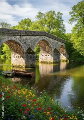 © Firly, Fototapeta premium Picturesque stone bridge spanning tranquil river bordered by lush vegetation and vibrant blooms