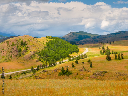 © sablinstanislav, Naklejka premium Picturesque summer mountain landscape with road through the pass. Turn on the asphalt mountain highway. Chuysky tract and a view of the North Chuysky Mountain range in the Altai, Siberia, Russia.