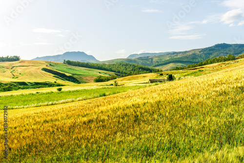Fototapeta premium picturesque sunset or sunrise in nice green and yellow shiny field with beautiful golden rows of wheat among highland hills and bright colorful evening sky with clouds on background