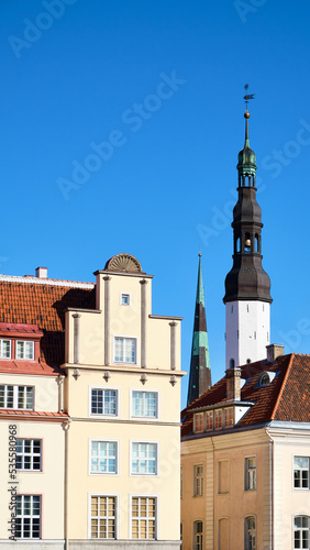 Obraz premium Picturesque Tallinn Town Hall tower and close-up on historic facades of ancient medieval buildings. Daytime, blue sky, historical city center of Tallinn, Estonia.