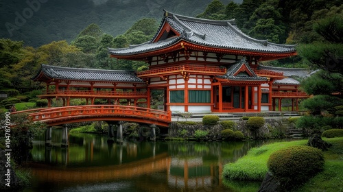 © pisan thailand, Fototapeta premium Picturesque traditional Japanese temple pagoda surrounded by a tranquil pond and lush green gardens reflecting in the calm water