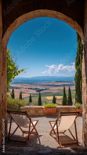 Obraz premium Picturesque Tuscan Landscape View Through Stone Arch with Deck Chairs...