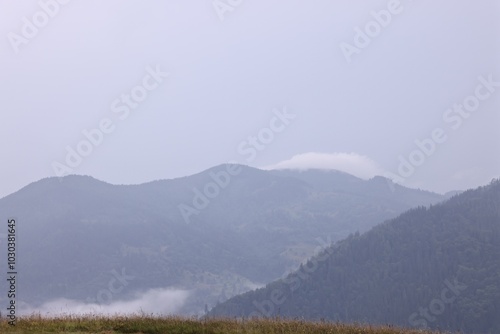 Fototapeta premium Picturesque view of beautiful mountains covered with fog