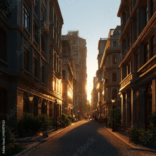 © Xayal, Naklejka premium Picturesque view of city street with beautiful buildings at sunrise