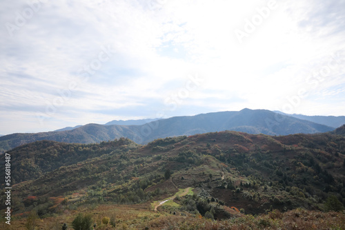 Fototapeta premium Picturesque view of green hills and mountains under cloudy sky