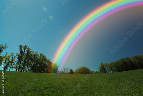 © New Africa, Naklejka premium Picturesque view of green meadow and beautiful rainbow in blue sky on sunny day
