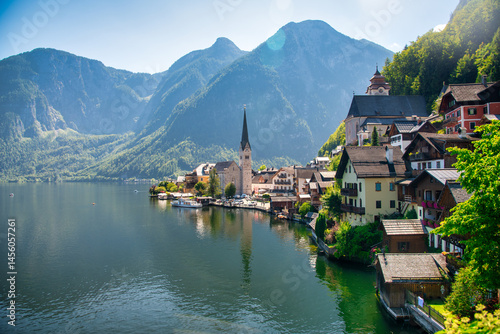 Fototapeta premium Picturesque view of Hallstatt city and lake, surrounded by stunning alpine mountains and serene waters