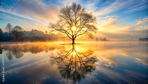 © vectorize, Fototapeta premium Picturesque view of leafless lonely tree growing in a lake at dawn with fog