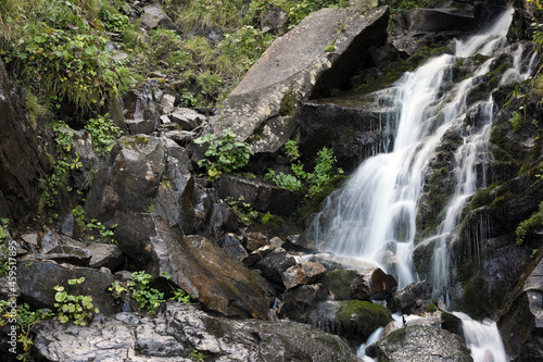 Naklejka premium Picturesque view of mountain waterfall and green plants