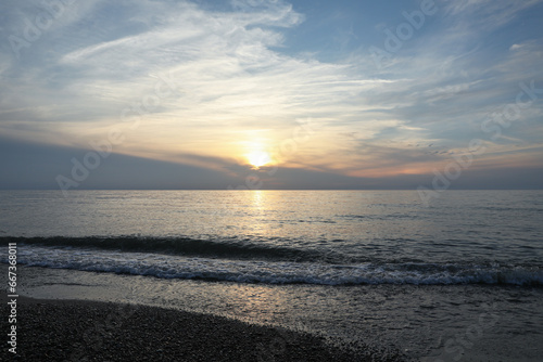 © New Africa, Naklejka premium Picturesque view of sea and tropical beach at sunset