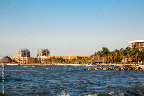 Naklejka premium Picturesque view of sea coast, palm trees and distant resort on sunny day