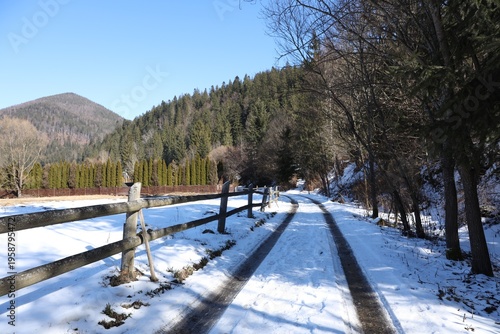 © New Africa, Fototapeta premium Picturesque view of trees, snow and mountains on winter day