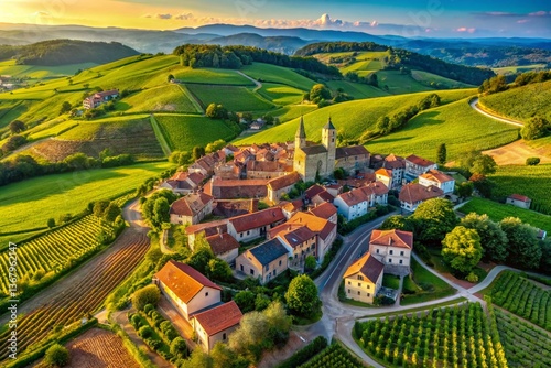 © Sirinporn, Fototapeta premium Picturesque Village Amidst Rolling Vineyards, Aerial View