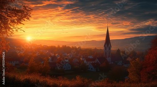 Fototapeta premium Picturesque village nestled under a vibrant sunset with a striking church spire