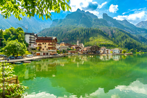 © unai, Naklejka premium Picturesque village of alleghe reflecting on lake alleghe in the italian dolomites
