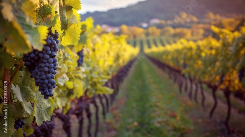 © Fightstar, Naklejka premium Picturesque vineyard during harvest season with blurred grapevines