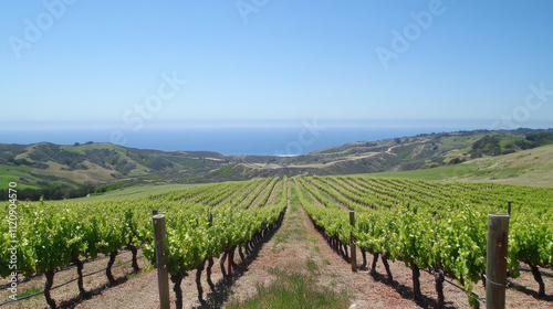 Fototapeta premium picturesque vineyard in rolling hills with ocean view