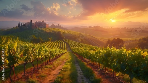 © theerachai, Fototapeta premium Picturesque Vineyard Landscape with Sunset and Winery
