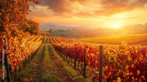 Naklejka premium Picturesque vineyards in autumn under a golden sun, the vines lined with red...