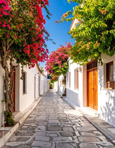 Fototapeta premium Picturesque whitewashed alleyway with bougainvillea