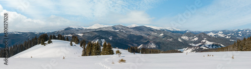 Fototapeta premium Picturesque winter mountain view from alpine path with footprint. Skupova mountain slope, Ukraine, view to Chornohora ridge and Pip Ivan mountain top with observatory building, Carpathian.