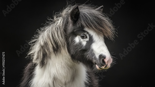 Fototapeta premium Piebald horse portrait on black background capturing unique fur patterns and...