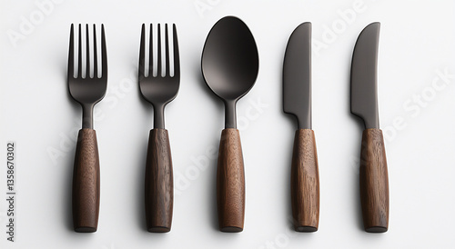 © Sung Hwan Kim, Fototapeta premium 3-piece cutlery set with brown wooden handles, on a white background, photographed from above with studio lighting, high resolution and high detail,